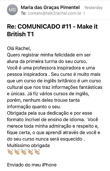 Além disso, minhas aulas e workshops trazem muito conteúdo prático e cultural para quem mora ou pretende morar no Reino Unido. Como sou britânica, incorporo no ensino muitas nuances, costumes e referências do meu país, para que você esteja sempre conectado à realidade local.